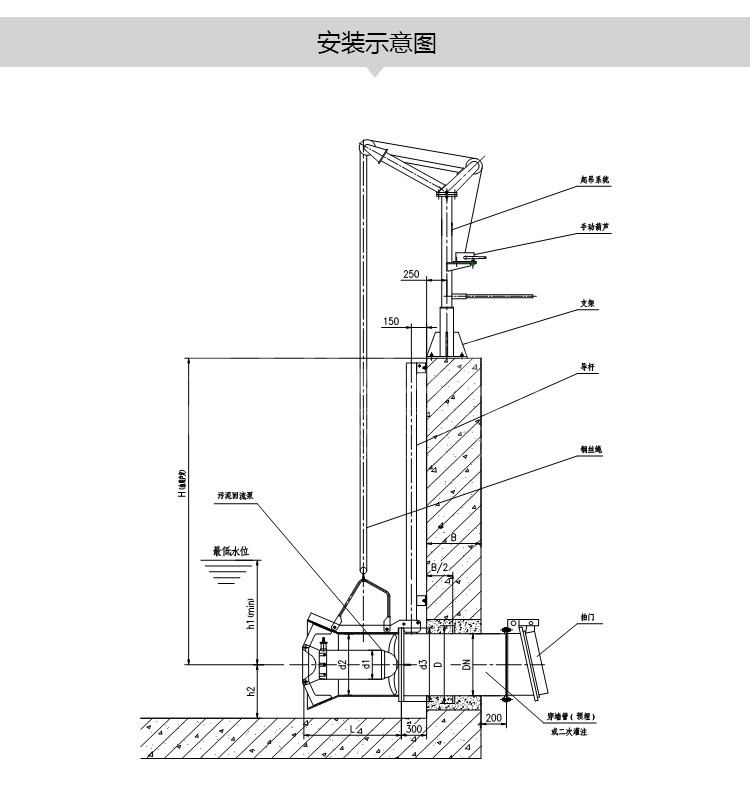 3 本設(shè)備除穿墻管需要預(yù)埋外,導(dǎo)桿、起吊架均用鋼膨脹螺栓與池體連接,不需要預(yù)埋件。