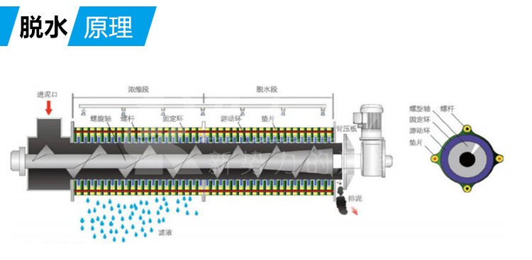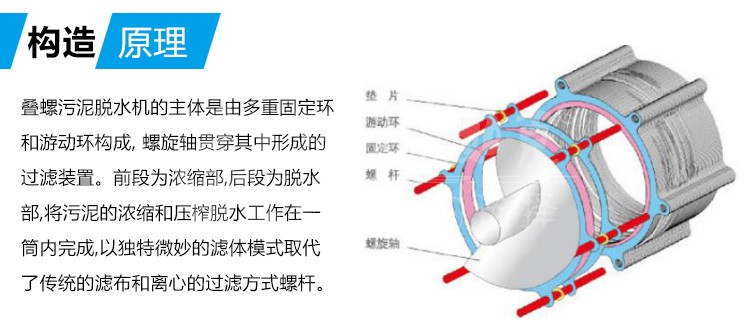 疊螺污泥脫水機(jī)是運(yùn)用了螺杄擠壓原理,通過(guò)螺杄直徑和螺距變化產(chǎn)生的強(qiáng)大擠壓力,以及游動(dòng)環(huán)和固定環(huán)之間的微小縫隙,實(shí)現(xiàn)對(duì)污泥進(jìn)行擠壓脫水的一種新型固液分離設(shè)備。