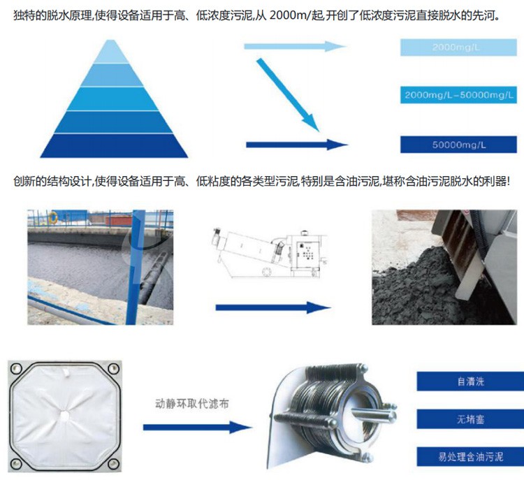 由于直接采用機(jī)械擠壓脫水,無(wú)需滾筒等大型機(jī)體,因而該機(jī)設(shè)計(jì)得相當(dāng)輕巧;機(jī)體幾乎全部采用不銹鋼材質(zhì), 更換部件只有螺旋軸和游動(dòng)環(huán),使用壽命長(zhǎng),經(jīng)久耐用。