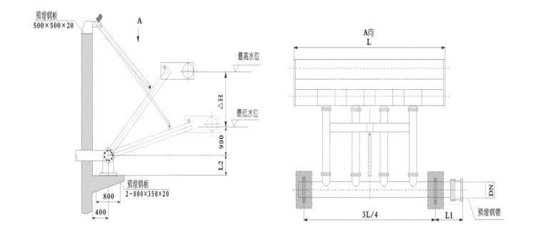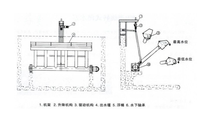 XB潷水器由潷水裝置、傳動(dòng)裝置、撇渣浮筒裝置及回轉(zhuǎn)支承等組成。驅(qū)動(dòng)機(jī)構(gòu)通過可伸縮推桿帶動(dòng)潷水裝置及撇渣浮筒裝置繞回轉(zhuǎn)支承旋轉(zhuǎn),從而使?jié)呖谏舷乱苿?dòng),達(dá)到潷出上清液的目的XB-L型旋轉(zhuǎn)式潷水器由集水槽、浮筒、排水管組、回轉(zhuǎn)支座、螺桿、連桿裝置、導(dǎo)軌及傳動(dòng)裝置組成。XB-D 型旋轉(zhuǎn)式潷水器主要由集水槽、浮筒、排水管組、回轉(zhuǎn)支座、電動(dòng)推桿及電控箱等組成。XB-F型旋轉(zhuǎn)式潷水器主要由集水槽、浮筒、排水管組、電磁閥、液位計(jì)及電控箱等組成。