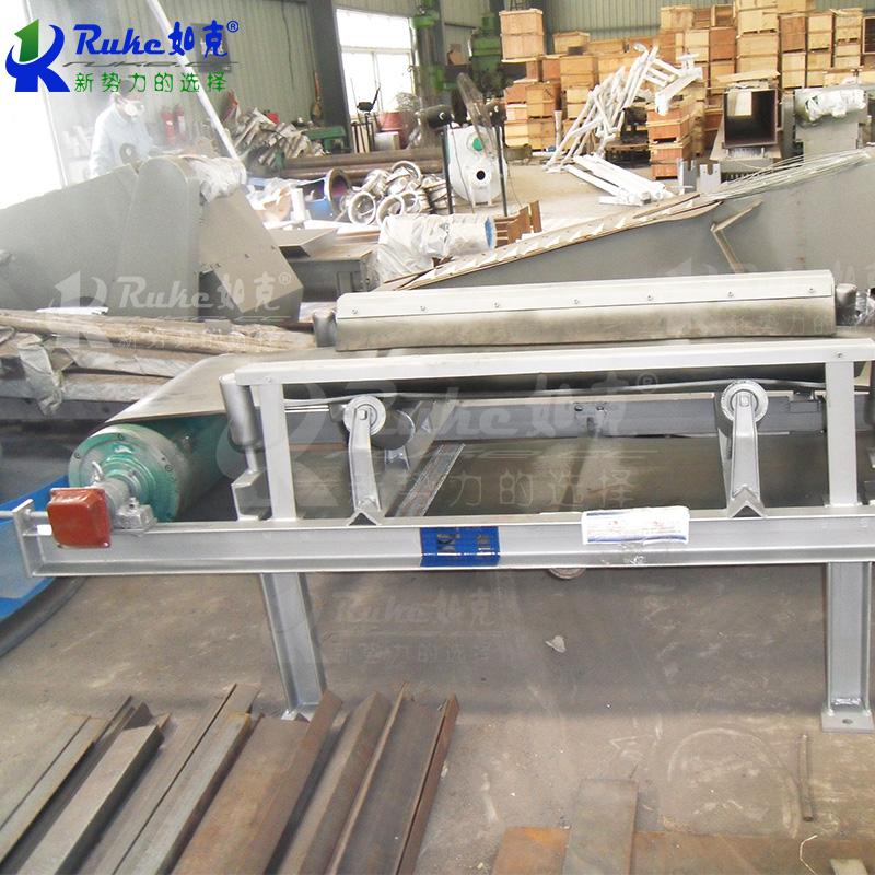 該設備采用連續(xù)式槽形帶式,物料由格柵或脫水機卸料口落入輸送帶上,在電動滾筒的驅動下,物料從一端移動到另一端,末端與垃圾桶相銜接,再另行處理。