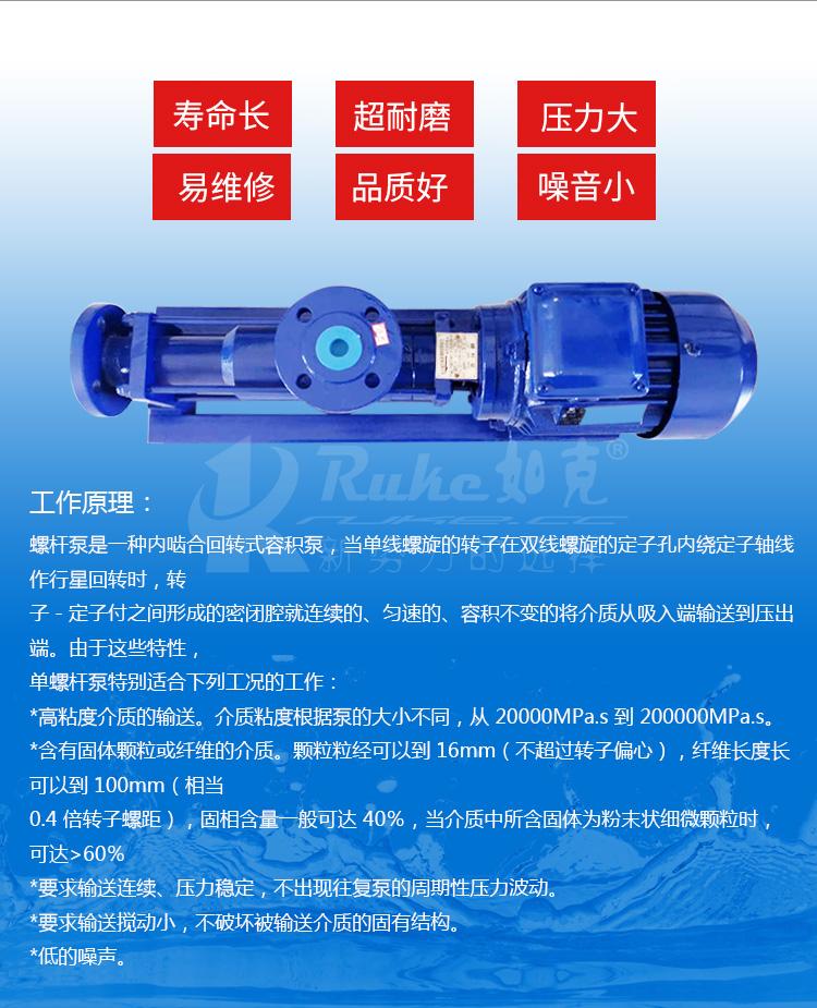 G系列螺桿泵是一種內(nèi)嚙合的密封式螺桿泵,屬轉(zhuǎn)子式容積泵。單螺桿泵輸送介質(zhì)時擾動小、泵壓穩(wěn)、吸入性能好,可以輸送粘稠的非牛頓液體及含有機械雜質(zhì)和固體顆粒的濃縮物,泵量