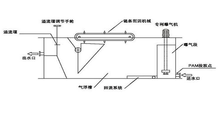 經(jīng)加藥反應(yīng)后的污水進(jìn)入氣浮的混合區(qū),與釋放后的溶氣水混合接觸,使絮凝體粘附在細(xì)微氣泡上,然后進(jìn)入氣浮區(qū)。絮凝體在氣浮力的作用下浮向水面形成浮渣,下層的清水經(jīng)集水器流至清水池后,一部分回流作溶氣使用,剩余清水通過(guò)溢流口流出。氣浮池水面上的浮渣積聚到一定厚度以后,由刮沫機(jī)刮入氣浮機(jī)污泥池后排出。