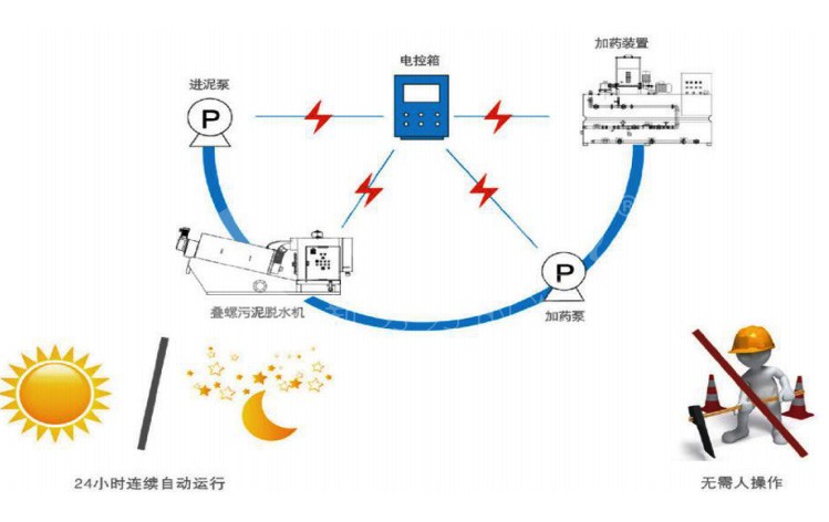 疊螺污泥脫水機(jī)從泵送污泥,加入藥液,排出泥餅均采用自動(dòng)控制,通過(guò)電控柜,加藥裝置,進(jìn)泥泵,加藥泵等進(jìn)行聯(lián)動(dòng),不需人員操作設(shè)備,運(yùn)行不會(huì)發(fā)生堵塞、濾帶走偏或其他影響工藝安全的現(xiàn)象,日常保養(yǎng)維護(hù)簡(jiǎn)更,可以 24 小時(shí)無(wú)人連續(xù)運(yùn)行。第一次真正意義上實(shí)現(xiàn)了污泥脫水連續(xù)全自動(dòng)運(yùn)行。