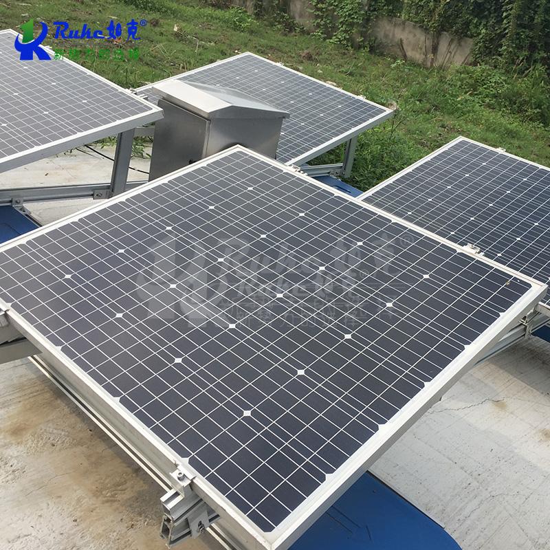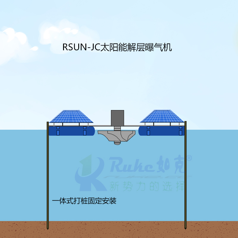 解層式太陽能曝氣機是以太陽能作為設備運轉的直接動力,設置旋切提拉曝氣葉輪,通過葉輪旋轉提升作用,將底部缺氧水轉移到水體表面與表層富氧水混合;表層富含水通過離心旋轉橫向水平擴散、縱向進入底層缺氧區(qū)。由此實現(xiàn)水體解層、增氧和縱橫向循環(huán)交換三重功效,將表層超飽和溶解氧水轉移到水體底層,增加底層水體溶解氧,消除自然分層,提高水體自凈能力。