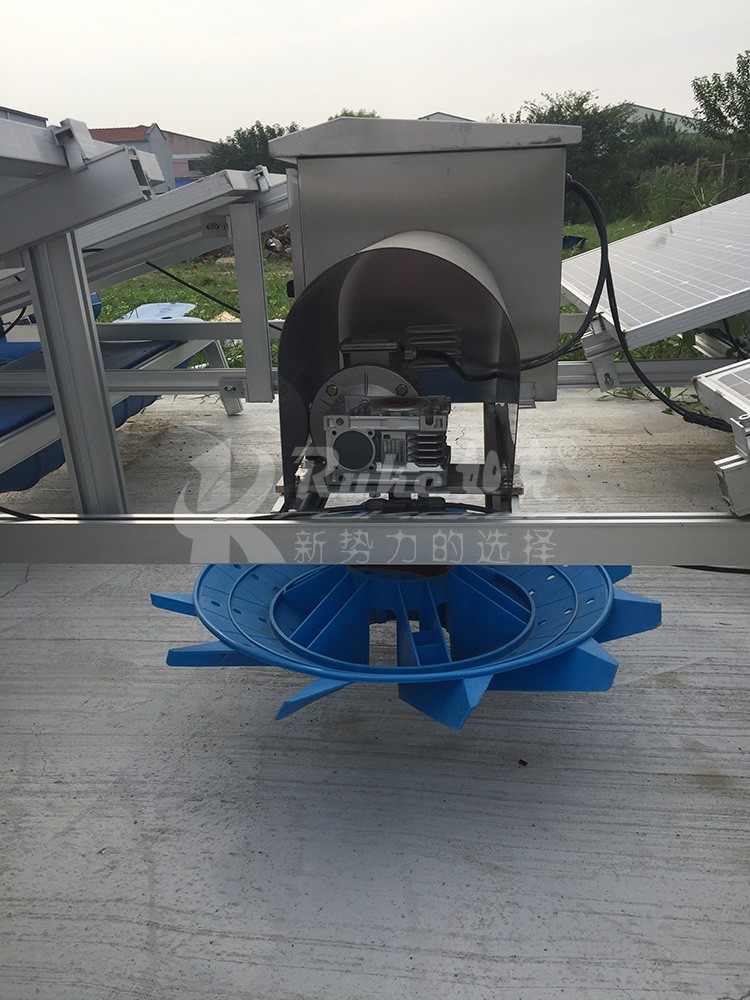 4、增氧機工作時,應使葉輪與水面齊平,在電壓不穩(wěn)或過低時,應升高葉輪,以減少電機負載。