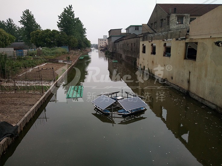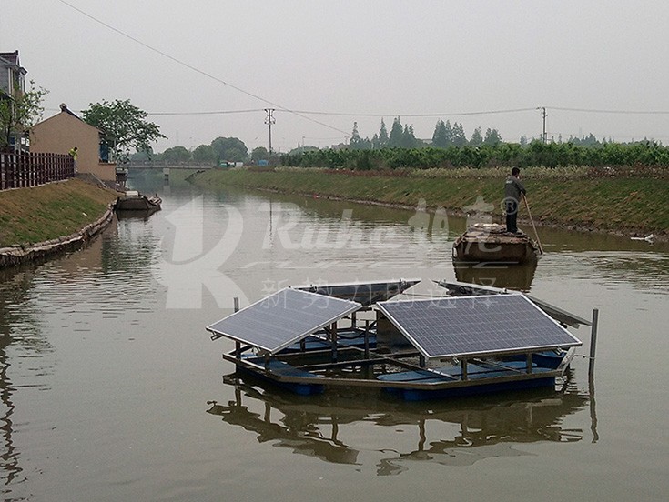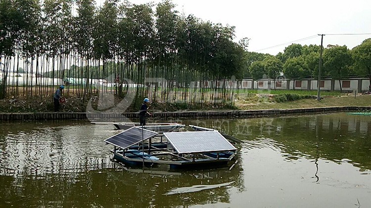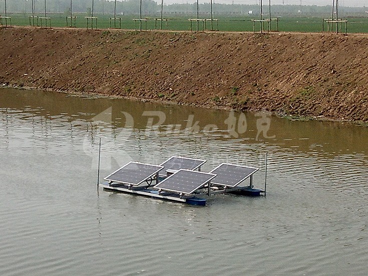 太陽能解層曝氣機由光伏板組件、蓄電池組、表面曝氣機,浮體、支架等主要部件組成,光伏帶動表面曝氣機葉輪運轉,旋轉的葉輪攪拌水體,形成水花和水膜,擴大水和空氣的接觸面,使氧氣和表層的有有氧物質及藻類快速融入水底,使表層和低層水質快速互換,排除水底廢氣,已維持水體生態(tài)平衡。